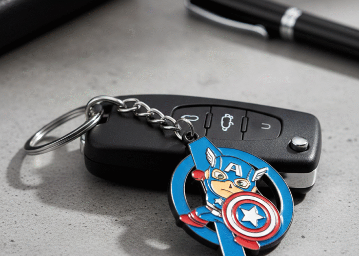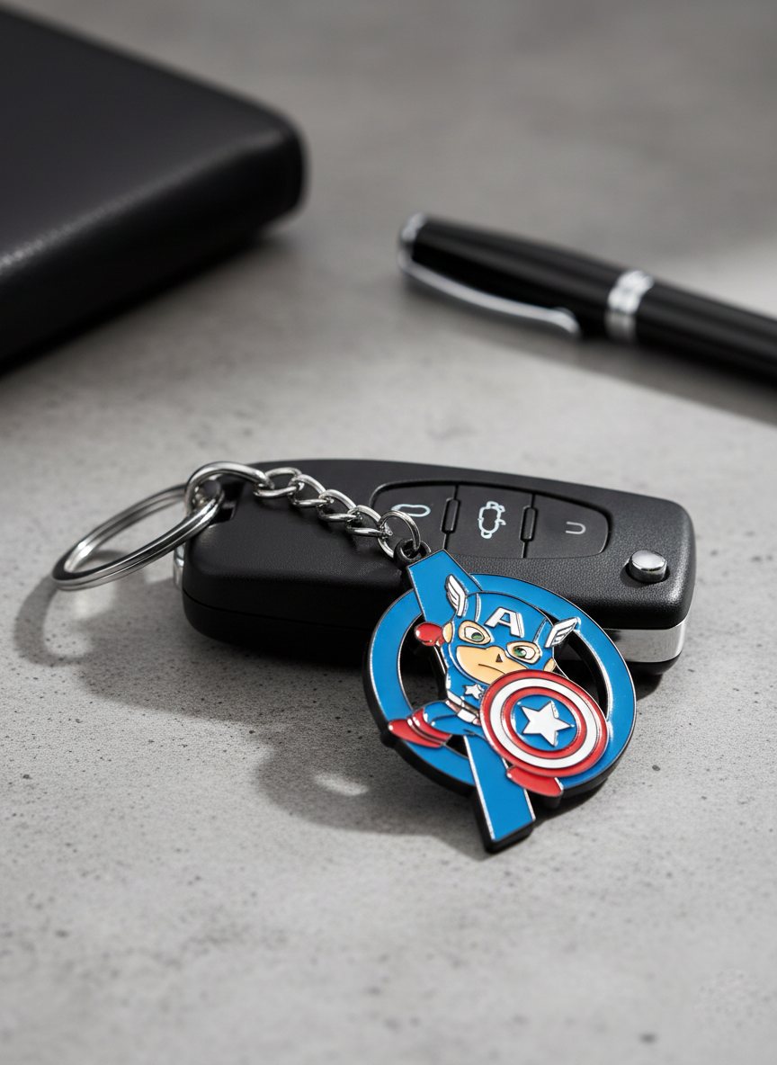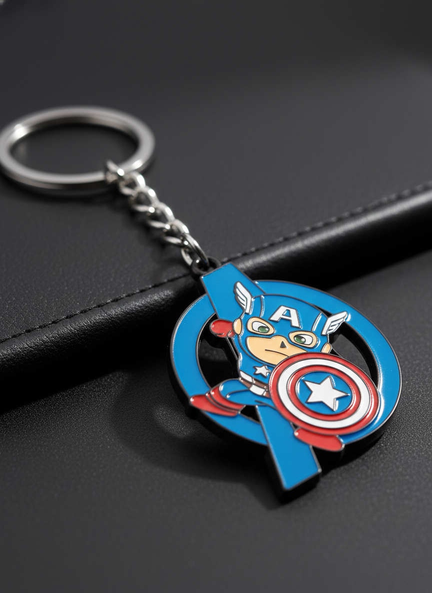 Premium Captain America rotating spinning metal keychain inspired by Marvel Avengers. Durable superhero key ring perfect for Captain America fans.