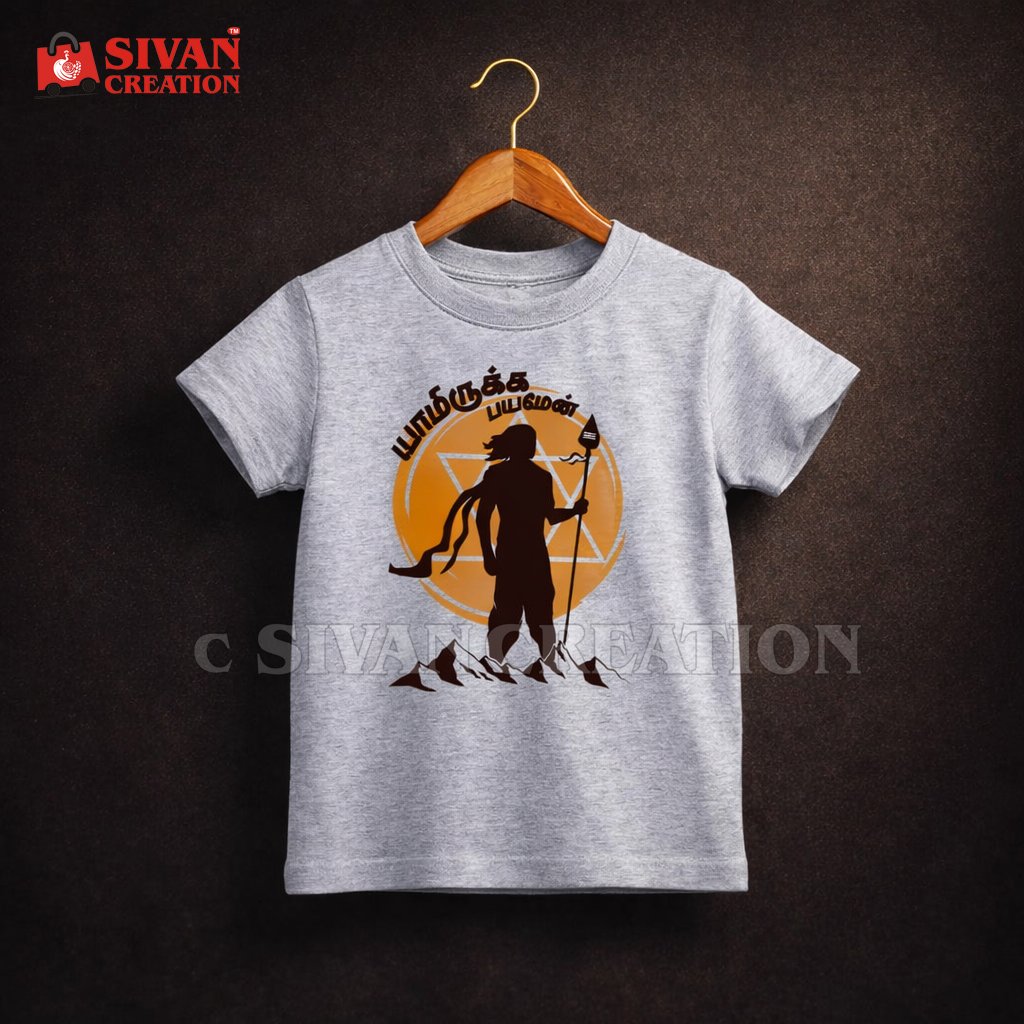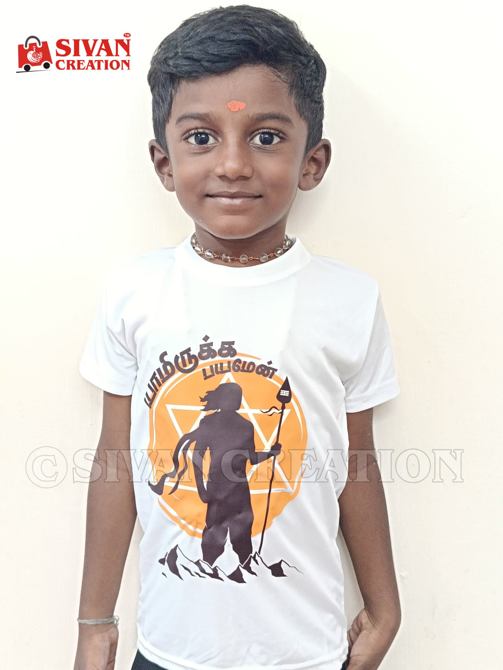 Give your child a divine and stylish look with this Kids White Round Neck T-Shirt featuring Lord Murugan with “Yamiruka Bayam Yen” Tamil text.