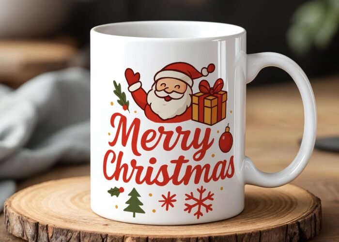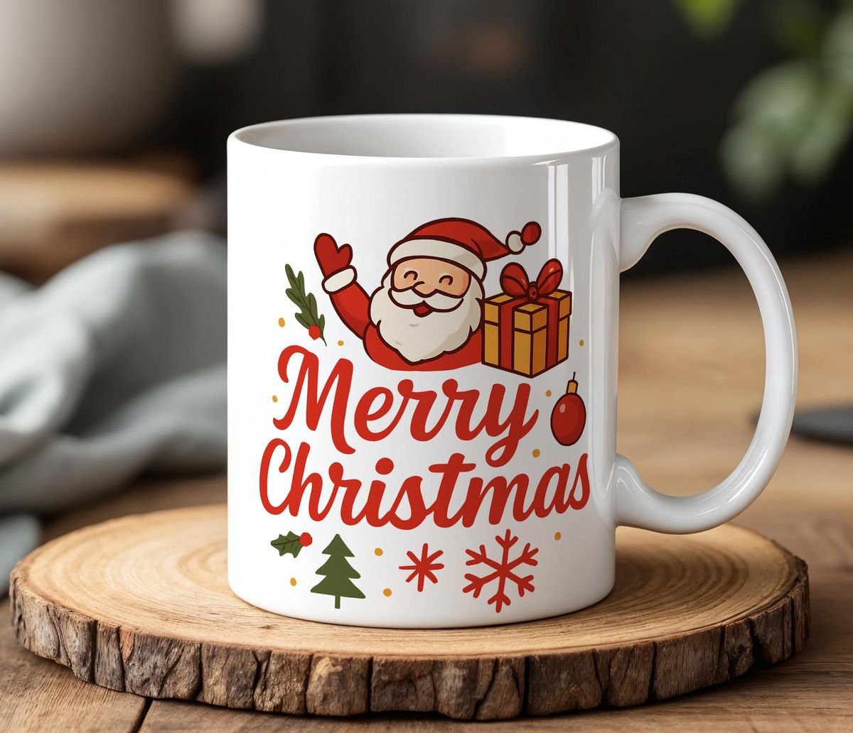 A festive Merry Christmas mug featuring a cute Santa design—perfect Christmas gift, holiday coffee mug, and cozy winter drinkware for hot cocoa, tea, or coffee.